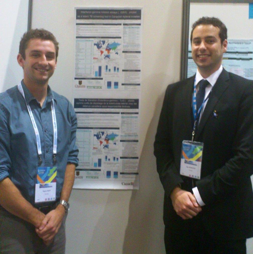 Ilan Schwartz and research collaborator Paxton Bach beside their tuberculosis research poster.“What I found surprising was just how much discordance there was between the TST and IGRA tests,” says Dr. Schwartz, who was a medical resident at Queen’s when he started this research. “Historically, all of those who tested TB-positive by the TST test would have been subjected to 12 months of drug treatments that can have considerable side effects.”