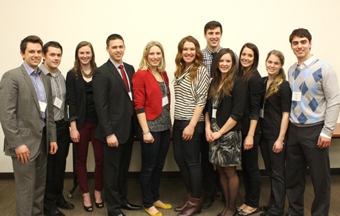 Queen's student athletes meet with Olympian Clara Hughes (left to right): Riley Whitlock, Brendan Sloan, Riley Filion, Ryan Zoehner, Elise Hoffmann, Clara Hughes, Jackson Dakin, Shannon Walsh, Lisa Minutillo, Kristin Smith, Rob Stellick.Canadian Olympic speedskater and cyclist Clara Hughes met with Queen's varsity athletes this week while on campus to speak at a Boys and Girls Club of Kingston fundraising dinner held at the Athletics and Recreation Centre.