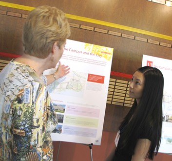Kim Graham (left) of Queen’s ITServices speaks with Christine Fang-Denissov from Urban Strategies Inc., Queen’s lead planning partner, about how to better integrate Queen’s campus and the surrounding community.During the first of two Campus & Community Open Houses for the Campus Master Plan (CMP), faculty, staff, students and community members dropped in to Stauffer Library to learn more about the CMP team’s preliminary findings. Queen’s planning partners were on hand to discuss the work so far and hear feedback from those who attended.