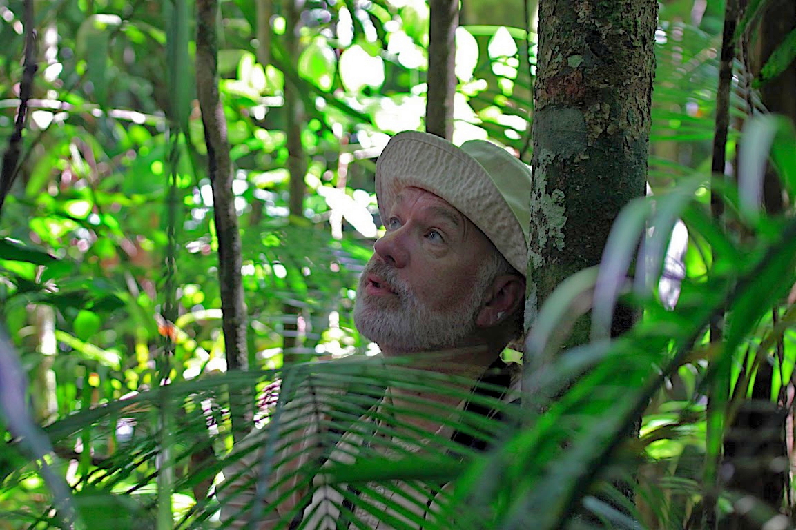 Dr. Bob Montgomerie on a recent trip to Brazil watchinga rare hummingbird. (photo credit: Bruce Lyon)