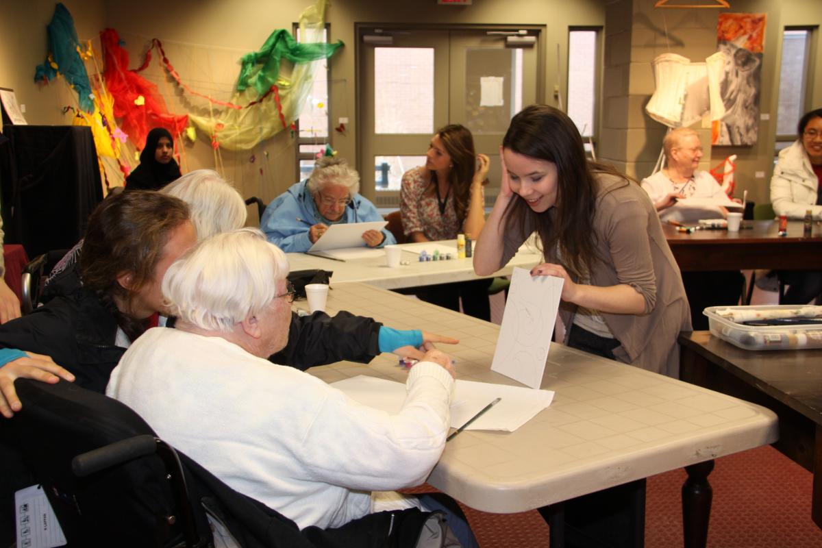 On April 8, residents from Providence Manor visited the Artist in Community Education (ACE) Exhibition in the Studio at Duncan McArthur Hall at Queen’s University. They were treated to story-telling and live music performances by teacher candidates, and they participated in visual arts activities led by teacher candidates in collaboration with Art-One-On-One, a Queen’s affiliated club of student volunteers.
