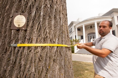 Matthew Barrett, Queen’s Grounds Manager and International Society of Arboriculture-certified arborist measures the circumference of an ash tree near Summerhill dating back to the 1920s.“The insecticide we use, TreeAzin, is injected directly into the tree — not sprayed — and presents little environmental risk. It’s a safe, responsible solution to a potentially devastating infestation” says Mr. Barrett, who also holds an Ontario exterminator’s licence and will conduct the tree injections himself. “The product is derived from botanical sources and degrades naturally within tree tissues. It poses little risk to bystanders, pets or the surrounding environment. It is a treatment that has been deemed safe for use in urban settings.”