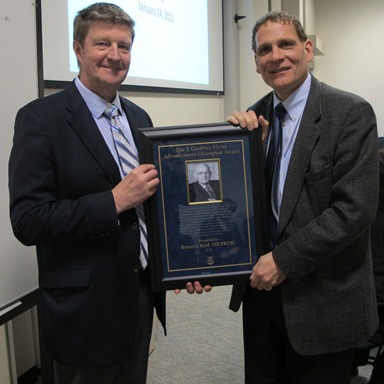 Principal Daniel Woolf presents the T. Geoffrey Flynn Advancement Champion Award to Dr. Robert Reid.Robert Reid’s work to enhance educational opportunities through philanthropic support has earned him this year’s T. Geoffrey Flynn Advancement Champion Award.