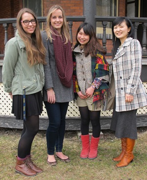 The interview project links Queen's students learning Japanese with Japanese exchange students. From left to right: Kelly Whiting (Artsci'13); Samantha Ortibus (Artsci'15); Japanese student Mei Takagi, who's studying at Queen's School of English; and Queen's Japanese instructor Mayu Takasaki.