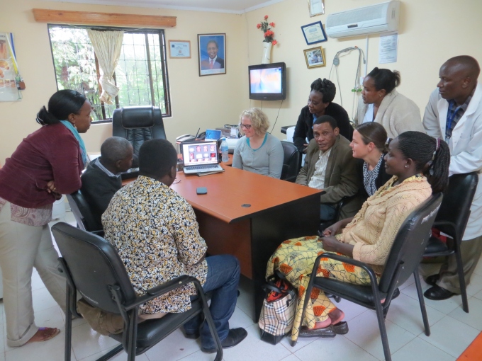 Karen Yeates meets with workers at a medical clinic in Tanzania to explain the bed nets program.Dr. Yeates’ first research project in Tanzania was implementing a cost-effective method of screening for cervical cancer using a cellphone. The Kilimanjaro Cervical Screening Project was funded by Grand Challenges Canada as part of the Rising Stars in Global Health program.
