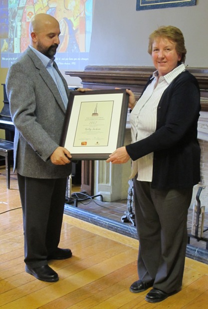 Kathy Jackson, last year's Steve Cutway Accessibility Award winner, receives her plaque from Deputy Provost Laeeque Daneshmend. This year's recipients of the Employment Equity Award, the Human Rights Initiative Award and the Steve Cutway Accessibility Award will be honoured on March 5.“The creation of an equitable community, one that is diverse, inclusive and respectful of its members’ human rights, requires the work of every member across the campus,” says Irène Bujara, director of the Human Rights Office at Queen’s. “The recipients of the Employment Equity Award, the Human Rights Initiative Award and the Steve Cutway Award set a wonderful example for others to follow.”