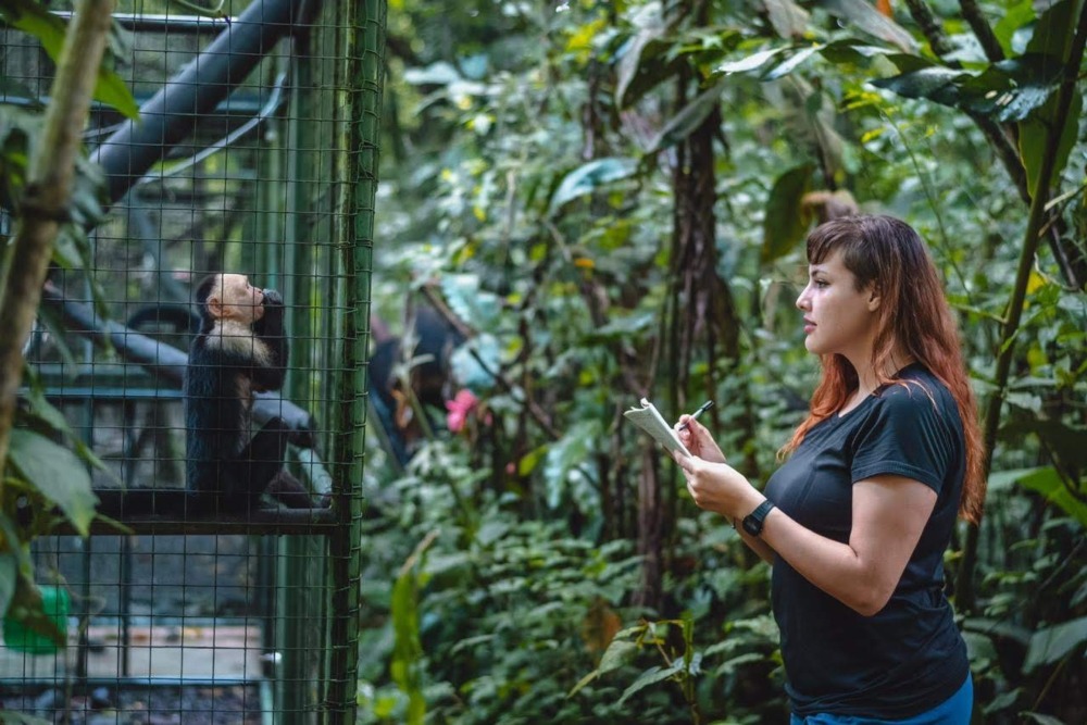 This was taken by Rubén Vargas at the wildlife sanctuary Proyecto Asis in Costa Rica, who captures the most beautiful images of the resident animals. I am standing in front of the capuchin enclosure observing the behaviours of Lulo, Lucy, Soplita, Pablita, and Cappuccino, while guided tours are taking place nearby. It is illegal to own wild animals in Costa Rica; these capuchins have been rescued from their past lives as companion animals or entertainers. While unable to be reintroduced to the wild, they receive life-long care and advocacy in the sanctuary community.