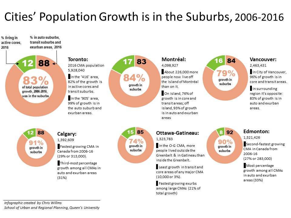 His research for the 1996-2006 period estimated that 66 per cent of all Canadians lived in some form of suburb. This proportion rose to 67.5 per cent by 2016. In the new census data, his research team found that within Canada’s metropolitan areas, 86 per cent of the population lived in transit suburbs, auto suburbs, or exurban areas, while only 14 per cent lived in active core neighbourhoods.