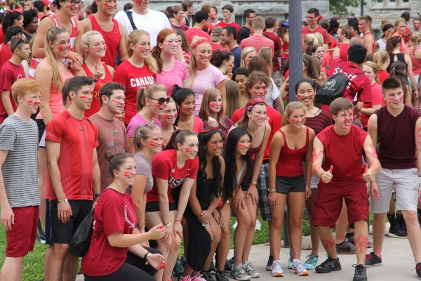 Crowds of students filled the campus on Labour Day, donning their team colours - red or blue - and getting in the spirit of orientation week by painting their faces as well.
