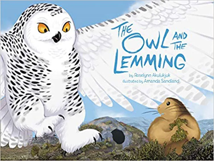 The Owl and the Lemming by Roselynn Akulukjuk, is about a lemming that outsmarts an owl trying to catch it for a meal.