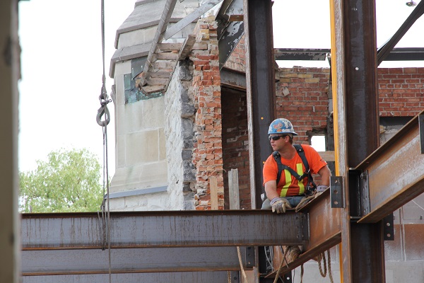 Behind the limestone façade facing Union Street, the new Innovation and Wellness Centre is beginning to take shape. The construction phase is now well underway with crews putting the heavy-duty structural steel in place.