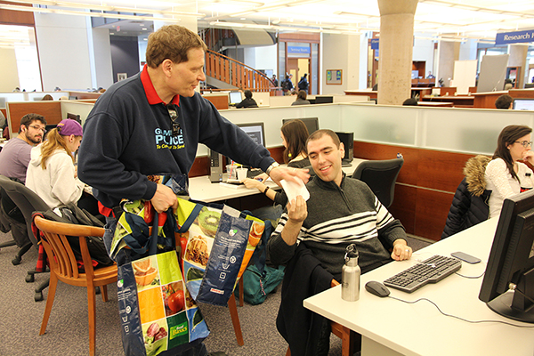 While studying for exams students received a bit of a break and a cookie from the principal. Together Principal Woolf and his wife handed out 1,200 cookies, their most ever, at the university's libraries, including the Education Library and Teacher Resource Centre, Bracken Health Sciences Library, Lederman Law Library, Douglas Library and Stauffer Library.