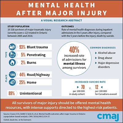 “Patients who suffer major injuries are at significant risk of increased admissions to hospital with mental health diagnoses in the years after their injury and also have high suicide rates during this period,” says Dr. Evans.