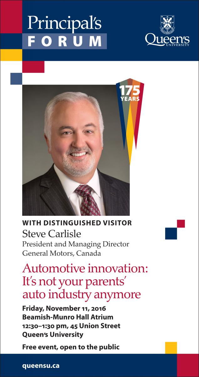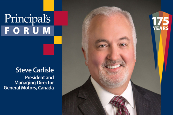 Steve Carlisle, President and Managing Director, General Motors of Canada, will visit campus on Nov. 11 as part of the Principal’s Forum distinguished lecture series. Mr. Carlisle will deliver a presentation on the importance of innovation in the auto industry, as well as future challenges and opportunities for the next generation of auto engineers.
