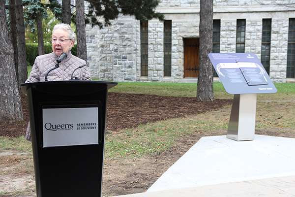 On Monday afternoon, Principal Daniel Woolf and senior executives; Indigenous leaders including Kanonhsyonne (Janice Hill) and Marlene Brant Castellano; and members of the Queen’s, Kingston, and local Indigenous communities gathered to unveil a plinth dedicated to the Anishinaabe and the Haudenosaunee peoples. The plinth, which includes a concrete base and a six page book, is the first in a series of monuments to be unveiled across campus as part of the “Queen’s Remembers” initiative led by Principal Woolf.