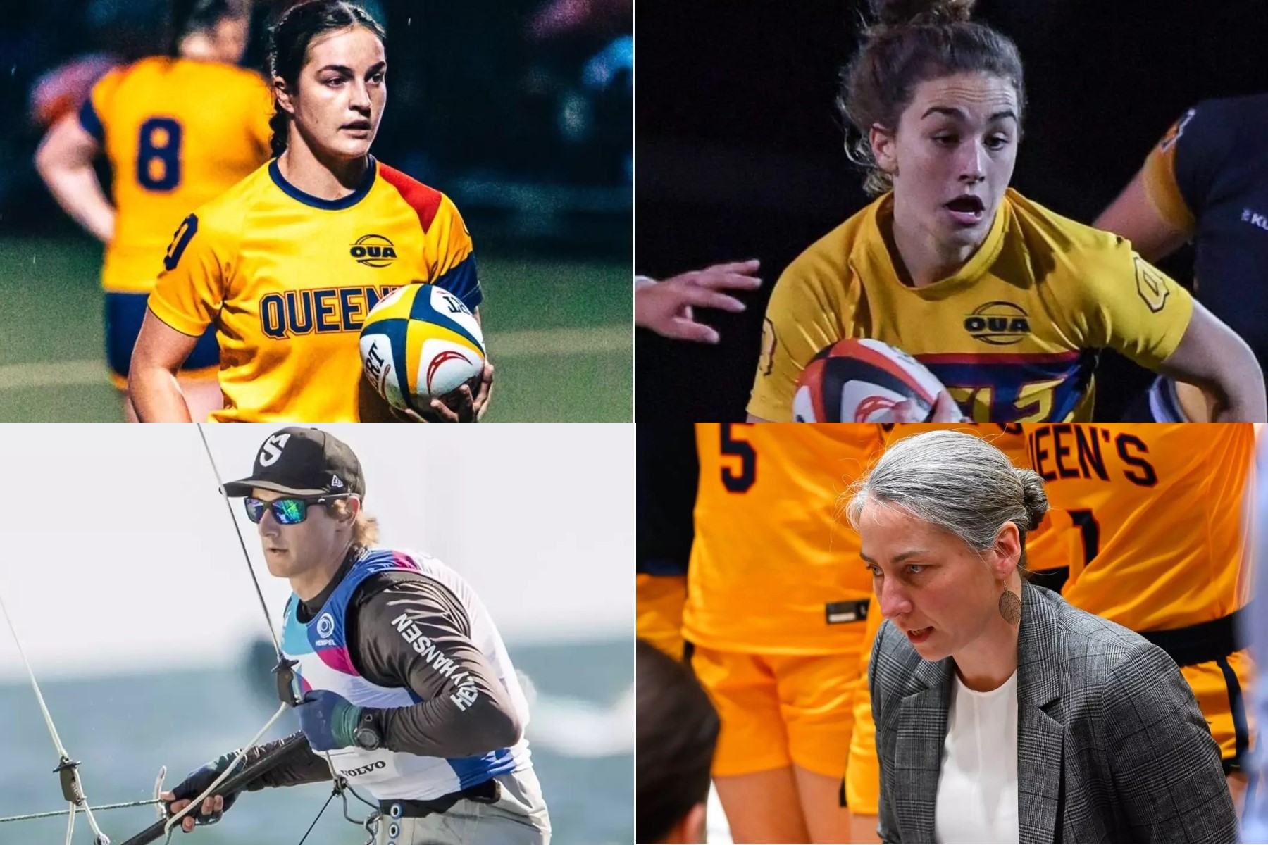 Queen’s community member are competing or coaching at the 2024 Summer Olympics in Paris. Clockwise from top left: Rugby players Taylor Perry and Chloe Daniels, basketball coach Claire Meadows, and sailor William Jones.