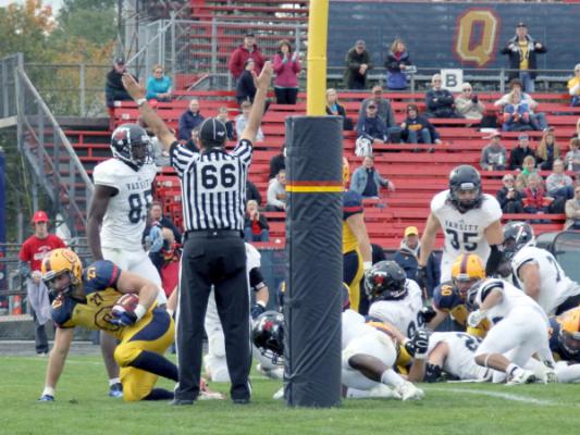 After Toronto made it 24-17, Carmichael responded for Queen's with his second touchdown of the game. When Jesse Andrews put the game out of reach early in the fourth quarter, making it 41-20, rookie Nate Hobbs took over quarterback duties. Hobbs connected with Doug Corby on a 60-yard catch and run for the first touchdown in his young Gaels career.