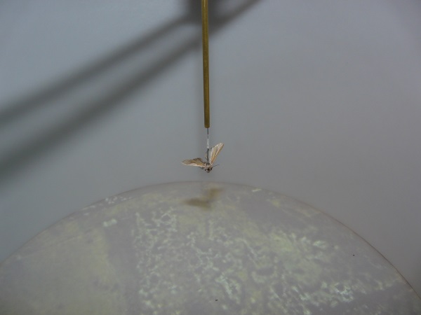 The scientists collected the moths by setting up an enormous spotlight to attract them. When they landed, Dr. Frost and his co-researchers gathered up all the moths. They glued a small sensor to their back called a stalk, wired the stalk to a computer and then suspended them in the flight simulator using wires with air blowing to keep them aloft. The computer tracked their direction of travel.