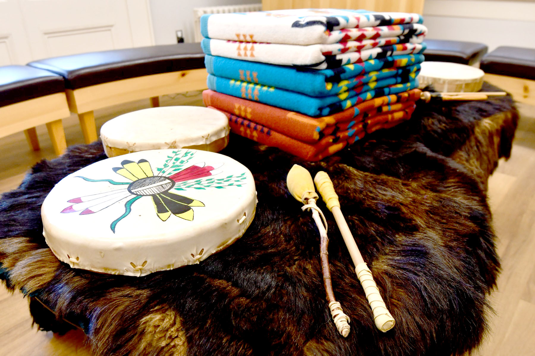 Blackfoot Peoples Mountain Blankets at the Four Directions Indigenous Student Centre in the lead up to convocation ceremonies, where they will be gifted to graduating Indigenous students.