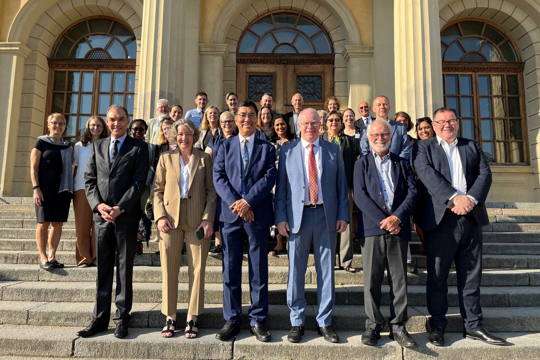 Representatives from the members of the Matariki Network of Universities, including Queen's Principal and Vice-Chancellor Patrick Deane, second from right in front row, gather on the stairs in front of the University of Uppsala in Sweden, following a signing ceremony to welcome South Africa's University of the Western Cape as the group’s eighth member institution.
