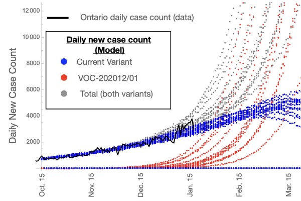 Day: There is a great deal of uncertainty with that projection, but we took estimates from its rate of spread in the UK and applied them to the outbreak in Ontario, under different assumptions about when the first cases arrived in Canada. If the first cases entered Canada in October (which is plausible given the extent of circulation in the UK at that time) and circulated undetected until recently, then we might expect it to become dominant in February or March. On the other hand, if it first arrived in Canada in December (as another example) this date would be pushed forward by about another two months.