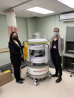Second-year Queen’s medical student, Chloe DesRoche (Right), has been part of this project from early on and was pivotal in assisting with the ethics approvals, communications with Health Canada, organizing logistics with Hyperfine, and training of the health care team in Moose Factory. She is pictured here with Dr. Elaine Innes, Project Co-PI and Chief of Staff at Weeneebayko Area Health Authority. Read more about Chloe's story here.