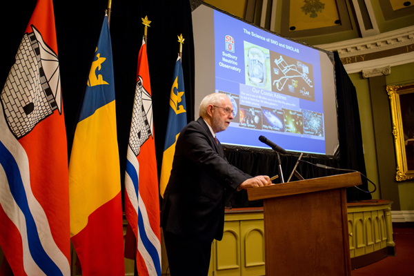 The lecture, titled, Neutrinos, Nobel and the Nature of the Universe, took attendees through the entire Sudbury Neutrino Observatory (SNO) experiment - from early planning, to deep underground in a Sudbury Mine, to the stage in Stockholm as Dr. McDonald accepted the Nobel Prize. Dr. McDonald also discussed the significance of the SNO findings to the broader physics landscape, described the next generation of SNOLAB experiments, and shared a few personal anecdotes from along the way.