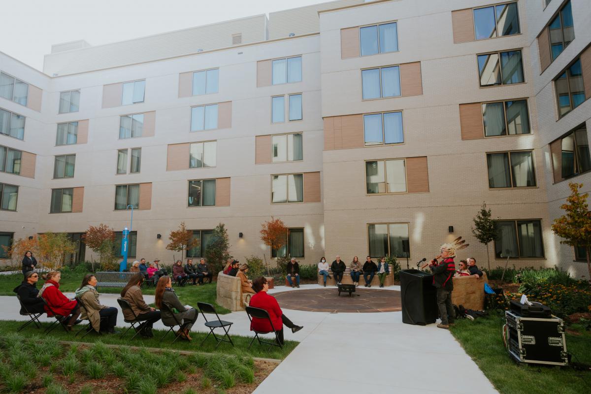 A dedication ceremony was held on Oct. 21, 2022, to mark the official opening of the space. Guests joined Queen’s senior leaders and Office of Indigenous Initiatives staff for the occasion and were treated to special remarks on the space’s artistry and importance, traditional Indigenous foods, and a musical performance by Maracle.