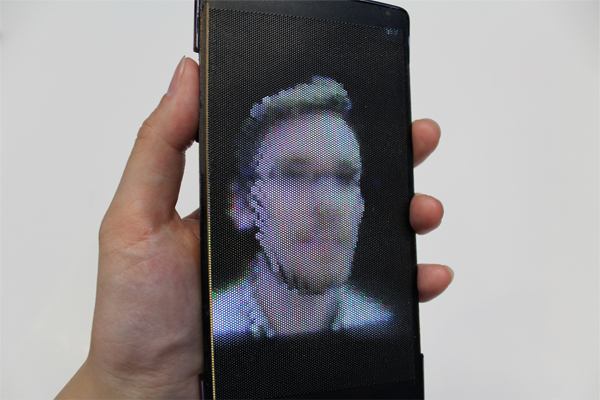 HoloFlex features a 1920x1080 full high-definition Flexible Organic Light Emitting Diode (FOLED) touchscreen display. Images are rendered into 12-pixel wide circular blocks, which create the full view of the 3D object from a particular viewpoint. These pixel blocks project through a 3D printed flexible microlens array consisting of more than 16,000 fisheye lenses, creating a 3D image in 160 x 104 resolution that which can be viewed from any angle simply by rotating the phone.