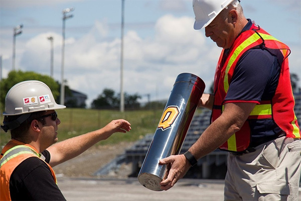 Queen’s football head coach Pat Sheahan, a Vanier Cup champion as head coach in 2009 with the Gaels, helped place the stainless steel capsules under the playing surface of the stadium.