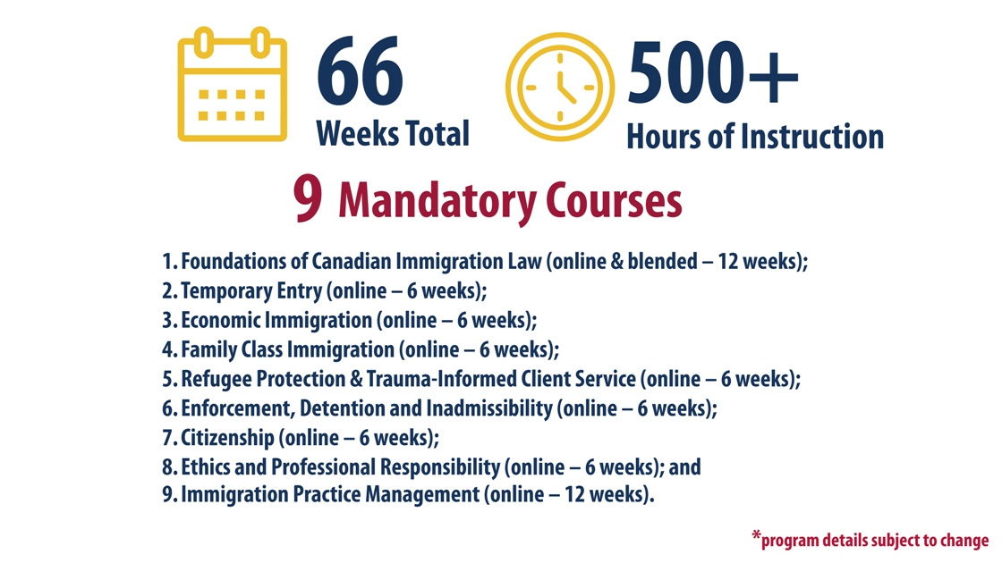 This program will be aimed at training students to write the ICCRC’s Regulated Canadian Immigration Consultant Entry-to-Practice Exam. Upon successful completion of this exam, graduates may apply to become a member of the ICCRC and, subject to successfully completing the registration process and being admitted to the Council, would then be permitted to offer immigration and/or citizenship advice and/or representation for a fee.