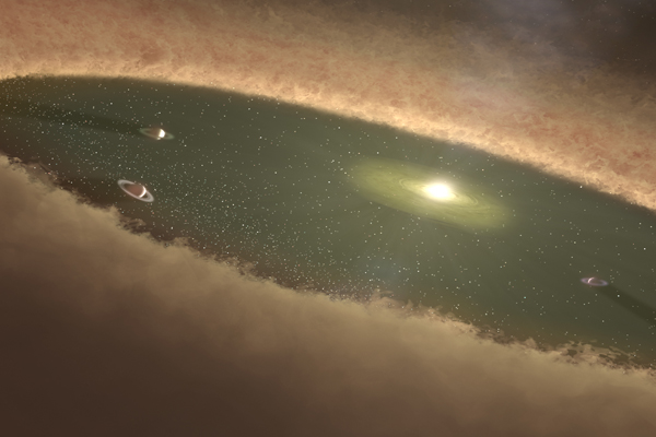 This artist’s concept of a young star system shows gas giants forming first, while the gas nebula is present. Dr. Duncan and his co-authors at the Southwest Research Institute (SwRI) used computer simulations to determine how Jupiter and Saturn evolved in our own solar system. These new calculations show that the cores of gas giants likely formed by gradually accumulating a population of planetary pebbles – icy objects about a foot in diameter.