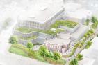 Rendering of the view of east terrace between Agnes Etherington House and the new pavilion. (KPMB Architects)