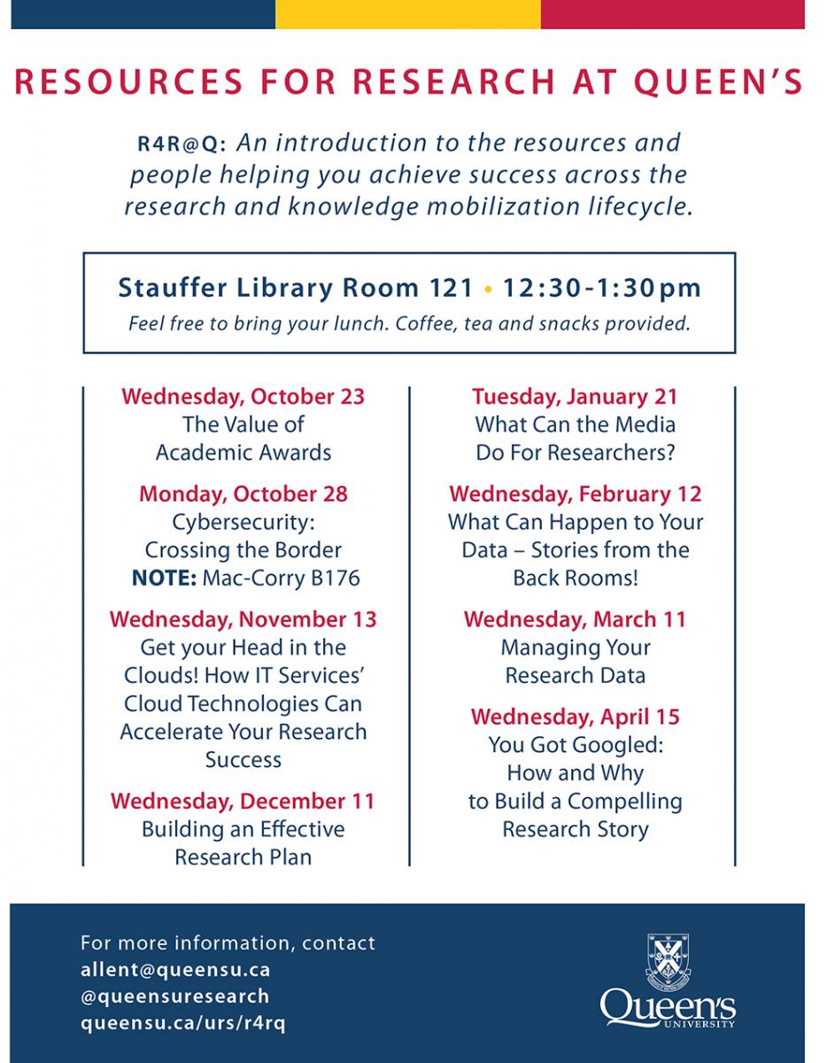 The Resources for Research at Queen’s (R4R@Q) series is a monthly, brown bag lunchtime series meant to connect Queen’s researchers with the resources and people that can help chart a course for research success.