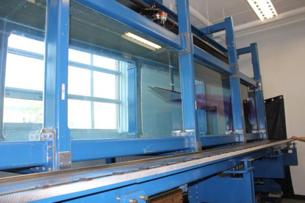 The OTTER is a glass tank holding approximately 15 tonnes of water. As models are towed through, their wakes are examined optically with four high-speed cameras. In this way, performance in terms of propulsive efficiency and maneuverability can be studied, providing insight into the form of natural swimmers and flyers found, such as birds and fish.