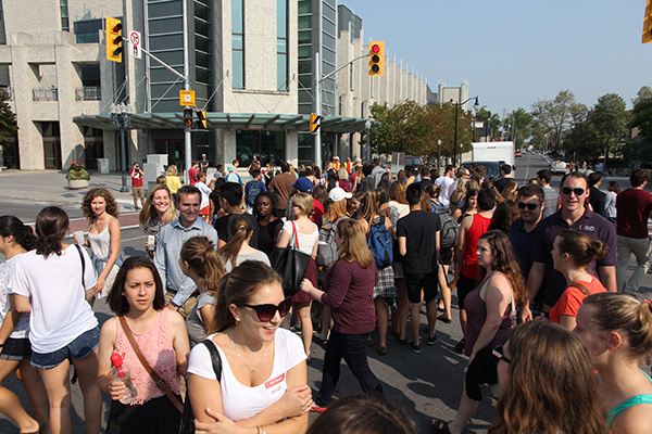 Dozens of students showed up for Monday’s event with the AMS, as well as Mayor Bryan Paterson and Coun. Stroud, and excitedly took to the diagonal crossing for the first time.