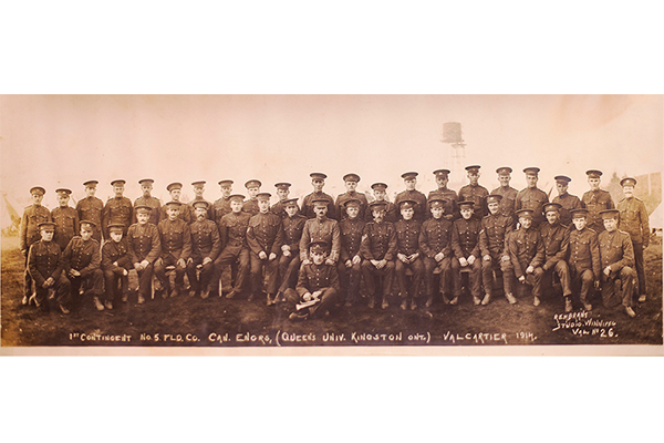 With the threat of war in Europe, Canada began to form volunteer units for military training. Queen’s University was the first Canadian university to form an officially recognized military unit, in 1909, comprising engineering students and faculty; the 5th Field Company. In August 1914, the government called upon the 5th Field Company when it needed space to train and prepare its soldiers. The men were sent to Valcartier, Québec. Their mission: turn acres of land into a highly organized camp for up to 30,000 men, with roads, a water supply system, and space for tents. Once the work was complete, the group was divided up – some headed across the sea to fight, while others supported the war effort from Canada.