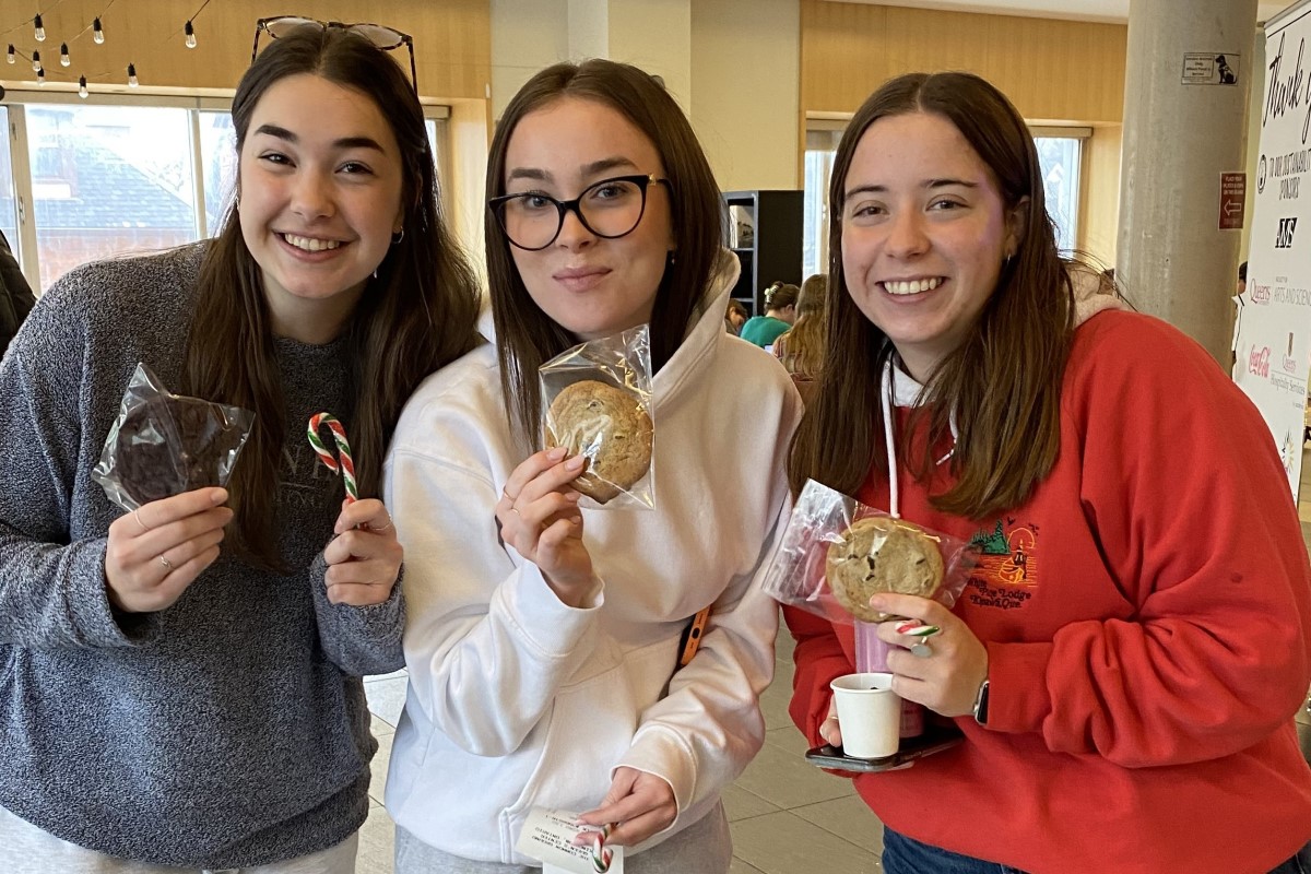 Small teams from Housing and Ancillary Services and Student Affairs walked along campus streets, and through buildings and libraries on Dec. 6, with “Gaels Gifts” – cookies, beverages, and other merchandise. In partnership with campus food and cold beverage providers, their random acts of kindness included treating students to their purchase at retail food locations and bringing in a special Coca-Cola “Hug Me” vending machine in the Queen’s Centre that dispensed free items.
