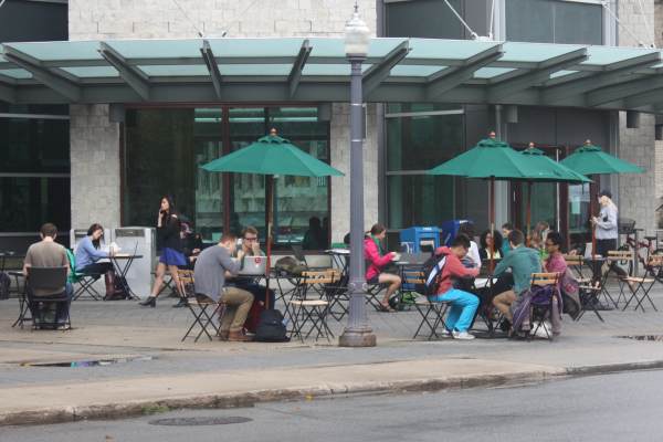 Molly Smith (MPL’15) and Shazeen Tejani (MPL’15) worked with Library staff to set up tables and chairs outside Stauffer Library Oct. 16-18 and observe how people used the space differently with outdoor furniture in place. Ms. Smith had the idea for the research project after establishing a similar “pop-up cafe” last summer during an internship in Cornwall.