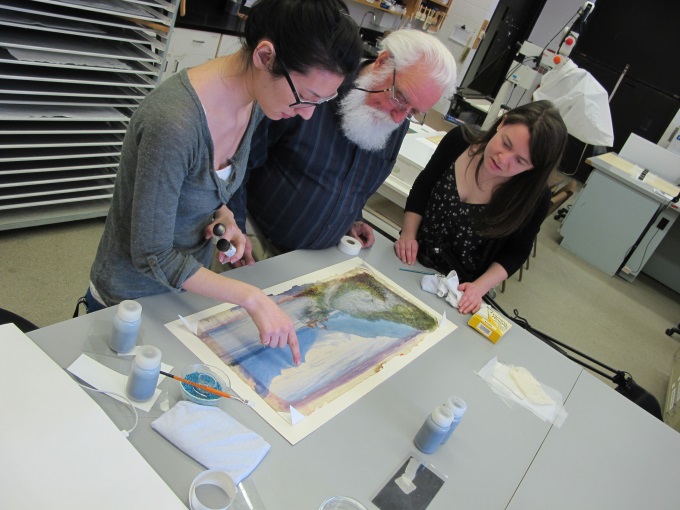 On a recent visit to the MAC labs, Mr. Hodkinson took a number of opportunities to interact with students and ask questions about their work. The professor emeritus says his favourite memories are summers spent with his students, doing internship work in the field. Two project highlights include the conservation of The Croscup Room, a group of scenic wall murals in Nova Scotia, now in the National Gallery of Canada, and the Church of Our Lady of Good Hope in the Northwest Territories. The church is now a national historic site.