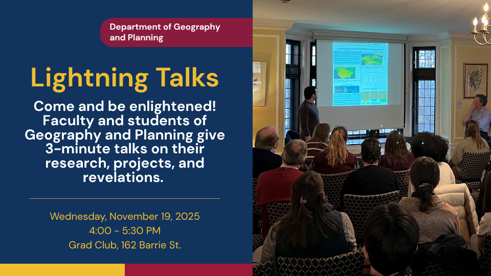 Come and be enlightened! Faculty and students of Geography and Planning give 3-minute talks on their research, projects, and revelations. Open to all students, faculty, staff, and members of the public.