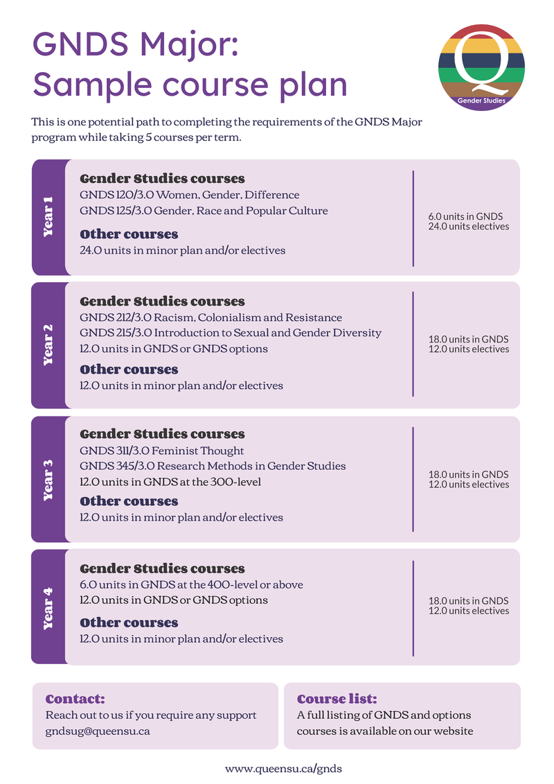 The BAH Major in Gender Studies is intended for students who would like a strong concentration in Gender Studies in combination with an equally strong concentration in another discipline or a double Minor in two other disciplines. The BAH GNDS Major option can be completed with most other departments in Arts and Science. Students apply to the Major plan after their first year in Arts and Science and should have completed either GNDS 120 or GNDS 125. See the Faculty of Arts & Science Academic Calendar for more information.