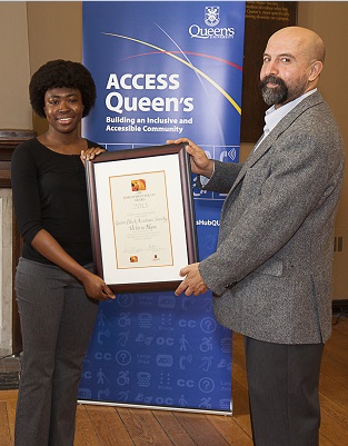 Victoria Nkunu accepted the Employment Equity Award from Deputy Provost Laeeque Daneshmend on behalf of the Queen's Black Academic Society.