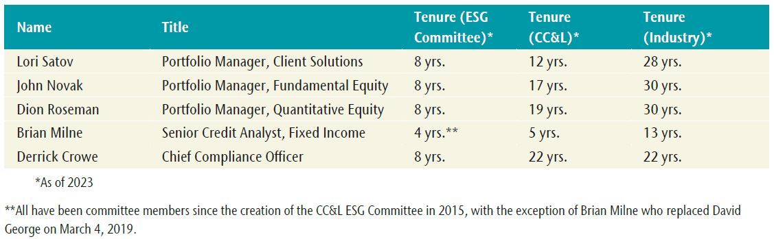While CC&L does not have a dedicated ESG team, the CC&L Board of Directors has ultimate responsibility for the firm’s approach to Responsible Investing (RI). The Board established the CC&L ESG Committee, which is comprised of leaders from each of the firm’s investment teams, client solutions team and compliance team. The composition of the committee was purposefully created to facilitate the flow of information between the committee and the investment teams, as well as to foster dialogue across investment teams. The ESG Committee reports directly to the Board and its mandate is to oversee and coordinate firmwide RI activities.