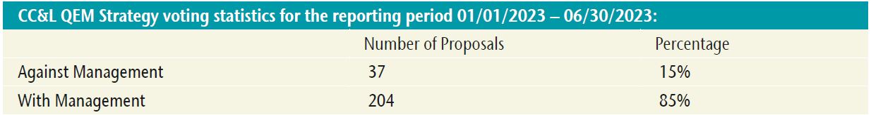 The quantitative equity investment team is not directly involved with engagement activities as engagement is not specifically part of CC&L’s quantitative equity process. That said, the S&E team and CC&L’s fundamental equity analysts and portfolio managers proactively engage with investee companies and collaborate with like-minded investors. The primary objectives of CC&L’s engagement activities are to improve and protect the long-term risk-adjusted performance of our portfolios and to improve the availability of decision-useful information available to investors. CC&L’s engagement activity currently focuses on the Canadian universe where CC&L believes they have the largest influence given their holdings across their fundamental and quantitative mandates. The outcomes benefit all of CC&L’s Canadian strategies, including their Canadian quantitative mandates.