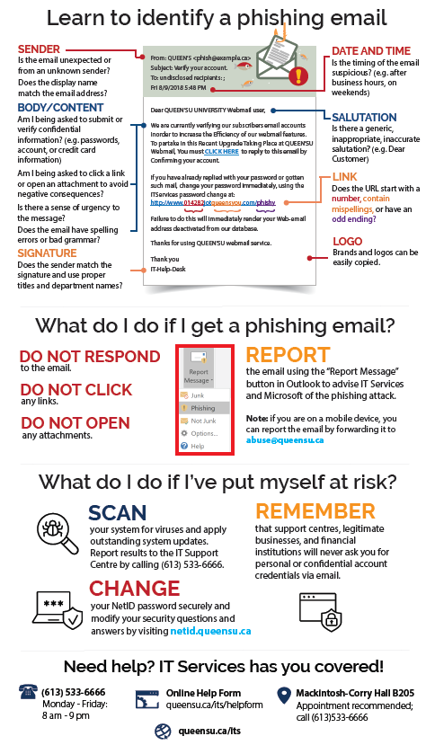 - Compromised legitimate accounts - Sometimes, phishing emails come from real Queen’s accounts that have been hacked. If you’re unsure, don’t reply, contact IT Support directly.