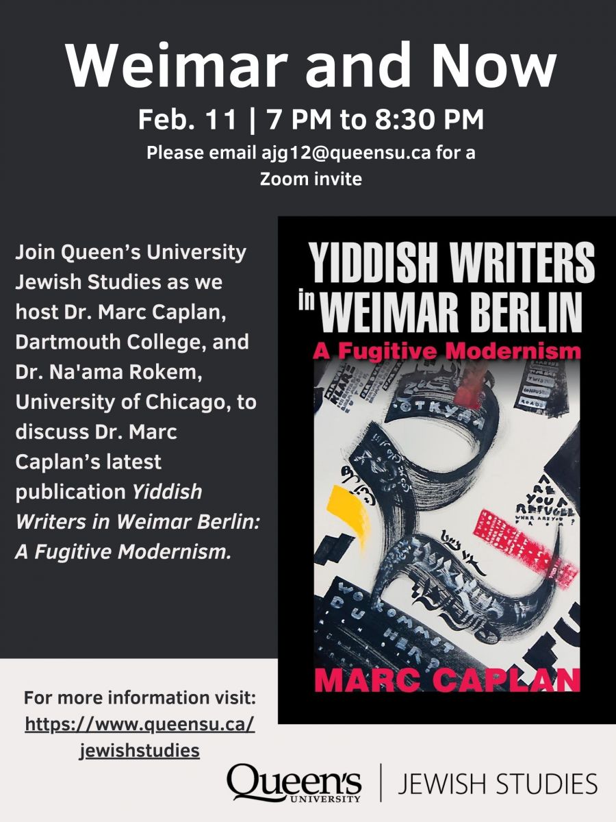 Online - ZoomJoin us February 11th at 7pm EST for a talk with Dr. Marc Caplan and Dr. Na'ama Rokem regarding Dr. Caplan's latest publication Yiddish Writers in Weimar Berlin: A Fugitive Modernism. Please email ajg12@queensu.ca for the Zoom link.