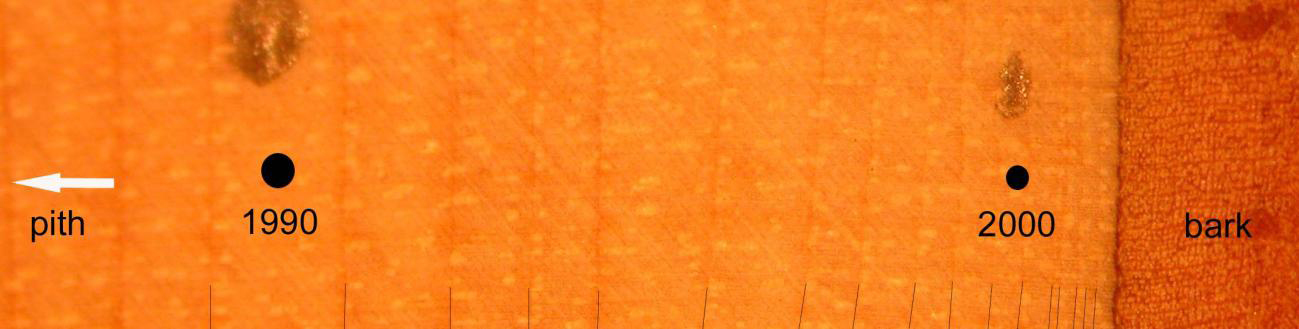 | Unimpacted Mackenzie Delta. In contrast to the widespread loss of vegetation resulting from the storm surge, the Mackenzie Delta is generally a landscape of healthy, green vegetation. Image courtesy of Trevor Lantz (University of Victoria). | Alder tree rings. Analyses of growth rings from alder shrubs showed growth declines related to several known storm surges in the past, and widespread death following the recent 1999 storm surge. Image courtesy of Michael Pisaric (Carleton University). | Collecting a sediment core. The removal of a 7.6 cm (3") diameter, 22 cm core from a lake in the Mackenzie Delta is carried out from a small raft, with the area accessed by helicopter. Image courtesy of Joshua Thienpont (Queen's University). |