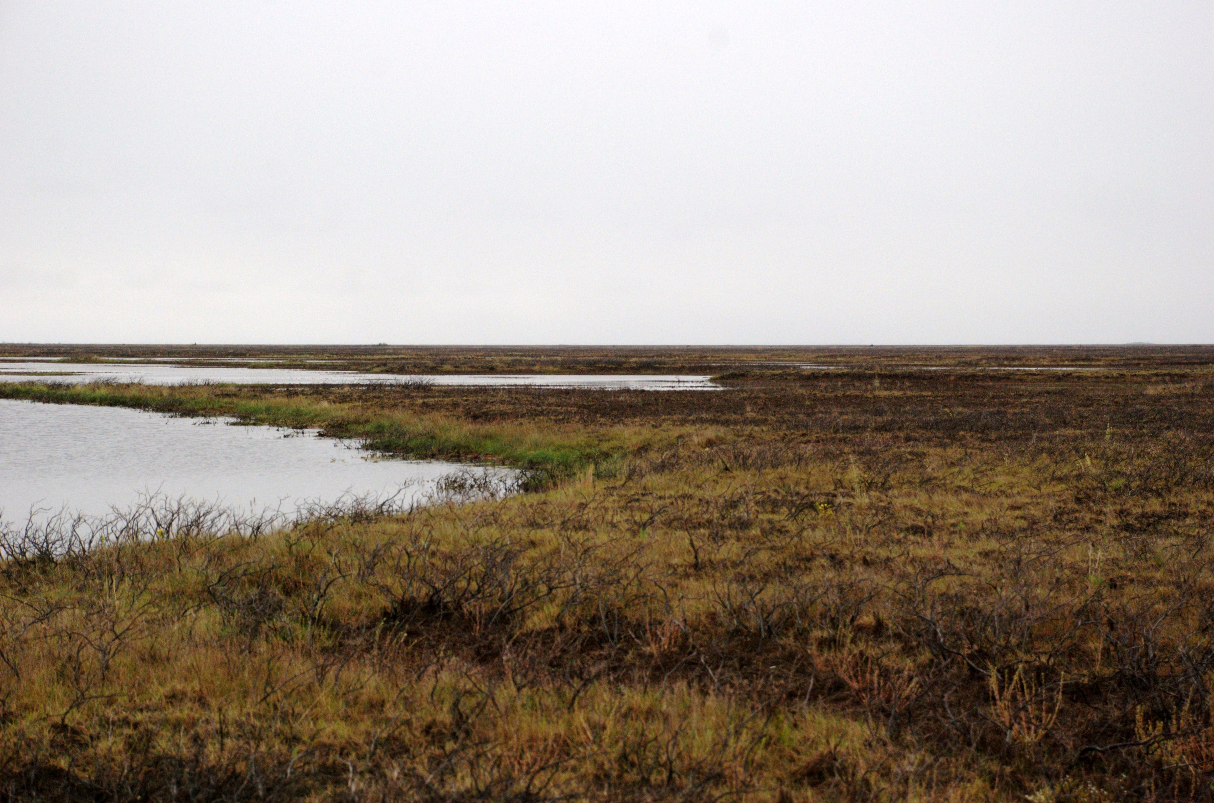 Dead vegetation in the outer Mackenzie Delta. The 1999 saltwater intrusion resulted in widespread death of vegetation (brown area at rear of photo along channel) across the outer NW Mackenzie Delta. Over 10 years later, little to no recovery has occurred. Image courtesy of Joshua Thienpont (Queen's University). |