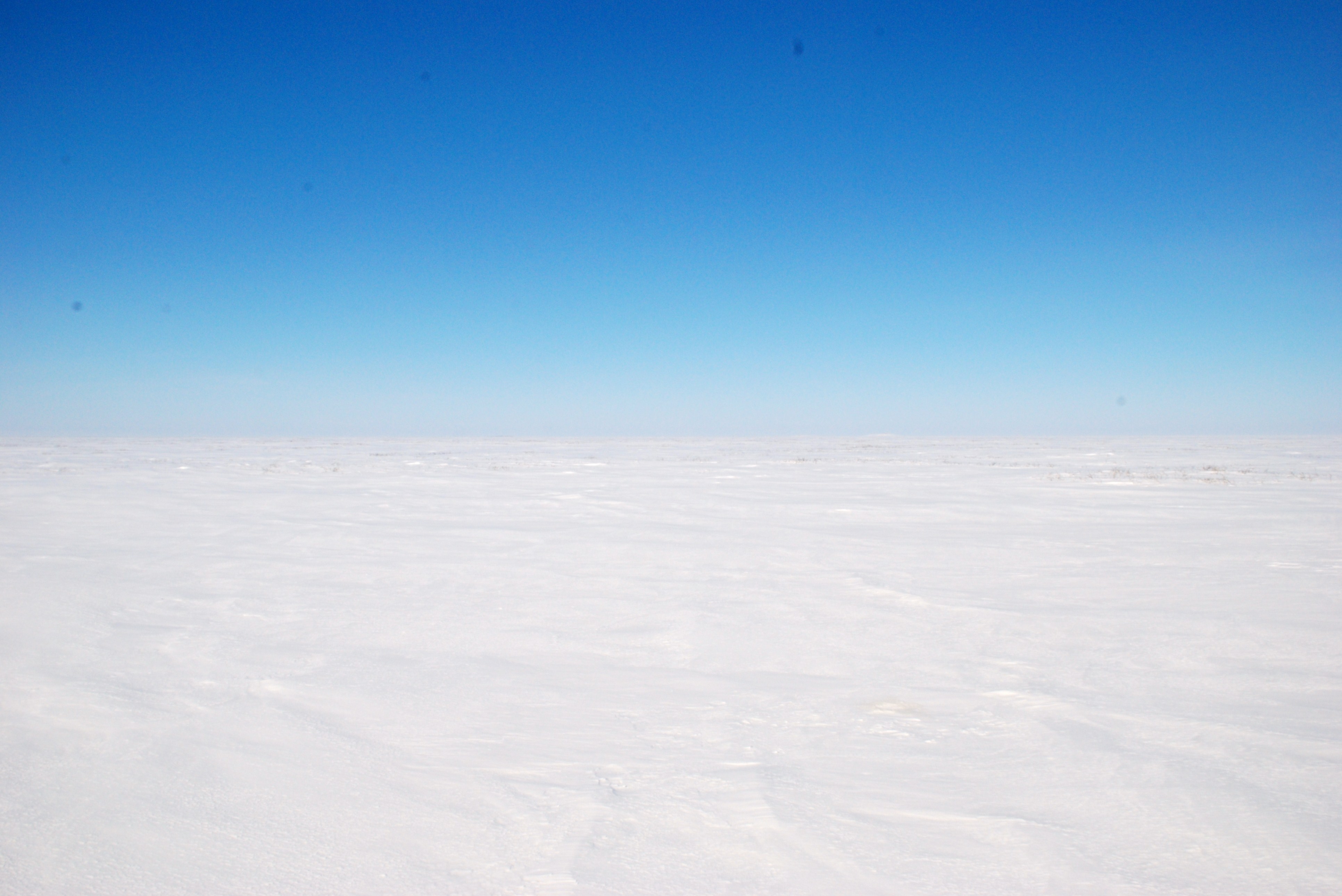 | Lake under cover of winter ice. The cold, harsh winter ice is the most suitable platform for obtaining sediment cores, as lakes can be accessed directly by helicopter. One of the problems can be determining what is lake ice and what is land, as the lack of trees results in very little relief. Image courtesy of Joshua Thienpont (Queen's University). | Dead